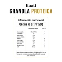 - Ingredientes: Avena arrollada, pasas de uva, miel, azúcar de caña integral mascabo, semillas de girasol pelado, almendras, maní, pasta de maní, aceite de girasol y sal marina.